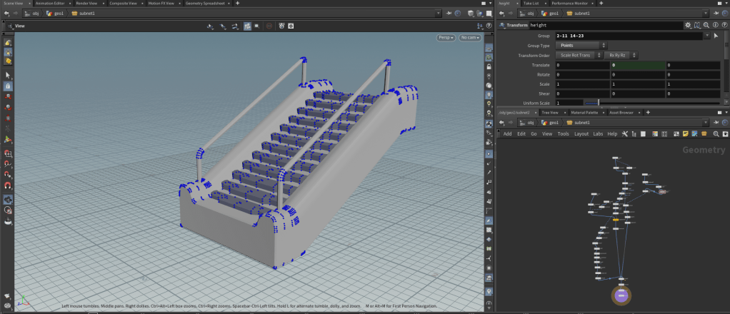 Use of nodes to retrieve desired points and primitives to then manipulate with parameters. Points and primitives can be grouped to have attributes changed. Use of the transform node to achieve more specific point transforms to later be added as a parameter in a subnet/HDA.