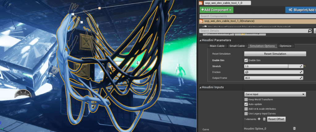 Use of vellum and timeshift to simulate cables in Unreal Engine w/ Houdini Engine.